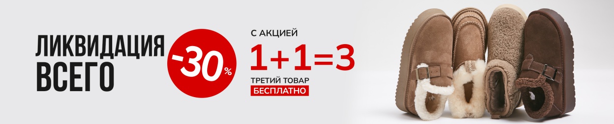 Условия акции: на весь ассортимент обуви предоставляется скидка -30%, а при приобретении товаров из ассортимента обуви и сумок, на третий товар с наименьшей ценой в чеке предоставляется скидка 100%. Скидка, равная 100% стоимости третьего товара, расписывается в чеке путём пропорционального уменьшения стоимости каждого приобретаемого товара. Скидка по акции не суммируется со скидкой по дисконтной карте и списанием бонусов. На товары, приобретенные по акции, может быть предоставлена рассрочка. Товары по акции невозможно приобрести по сертификатам и промокодам с определенным номиналом. Подробности у консультантов.