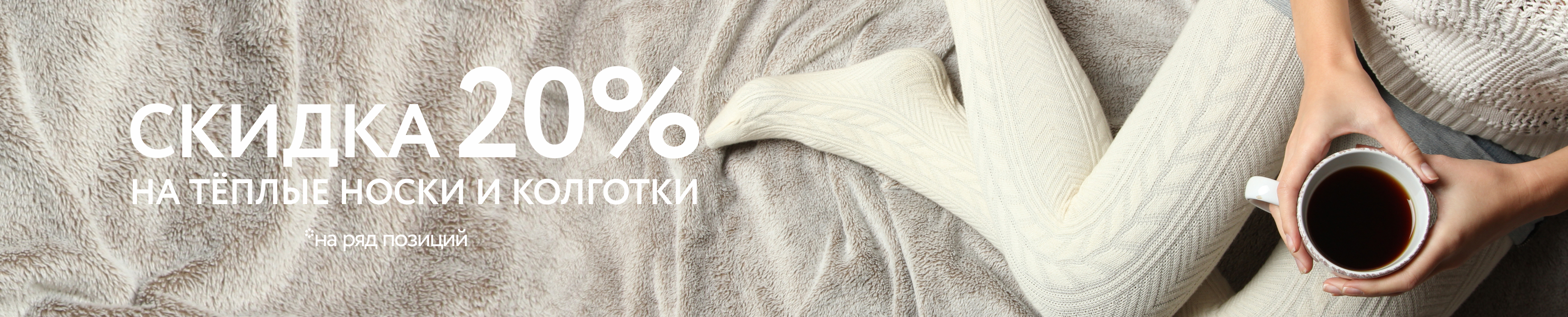 Условия акции: на ряд позиций из ассортимента тёплых колгот, кольсон, маек действуют скидки от 20%. Акция проводится в виде переоценки, итоговую сниженную цену покупатель видит уже на ценнике. Скидка по акции не суммируется со скидкой по карте покупателя.