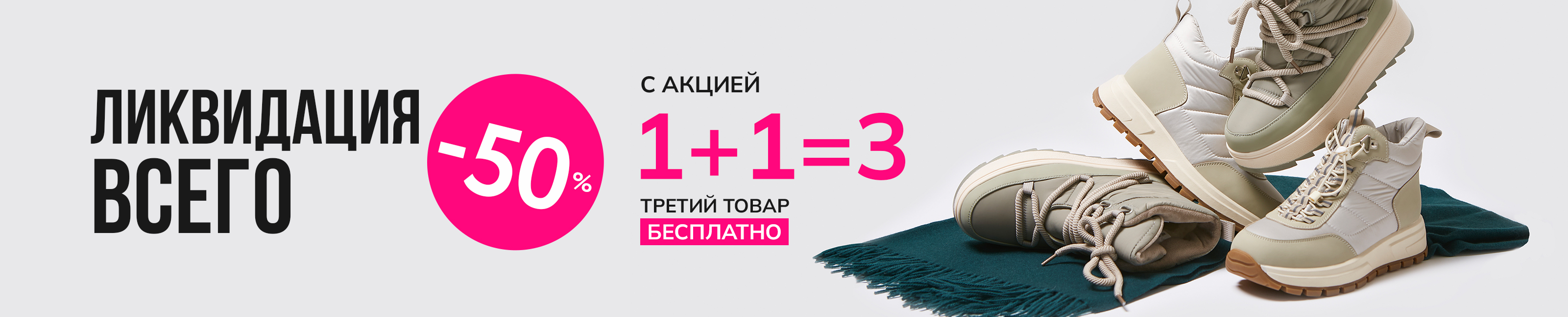 В представленных ниже магазинах в рамках Ликвидации скидка -50% действует на обувь и сумки, а также сочетается с акцией 1+1=3 :