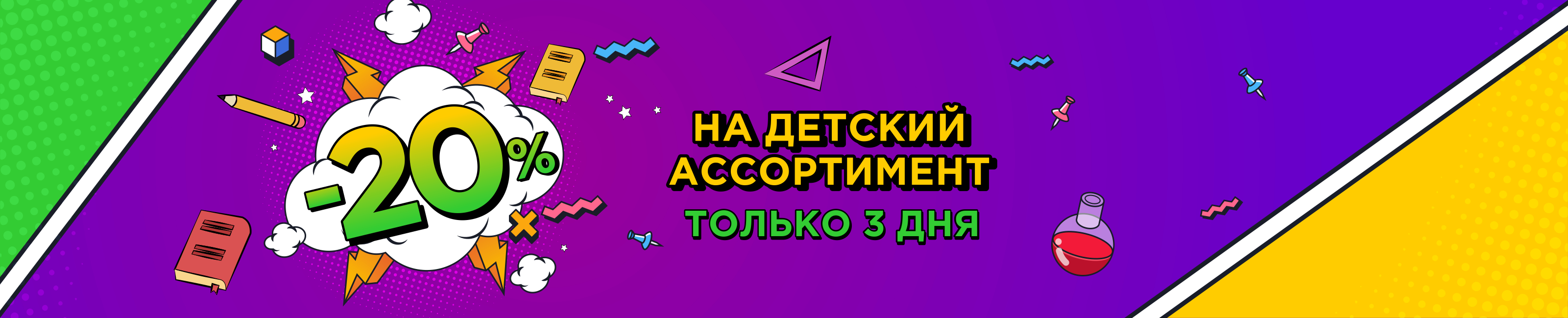 Условия акции:на товары детского и подросткового ассортимента (обувь, сумки, колготки, носки, гольфы, одежду) предоставляется скидка -%20. Акция предоставляется только на товары с одинарными белыми ценниками. Скидка по акции не суммируется со скидкой по карте покупателя. Товары по акции могут быть предоставлены в рассрочку.