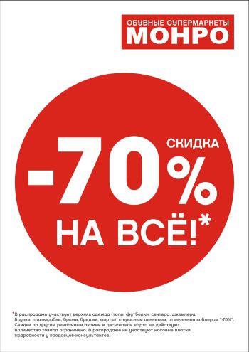 С 1.03.2012 в обувных супермаркетах «Монро» скидка на одежду - 70%*.
