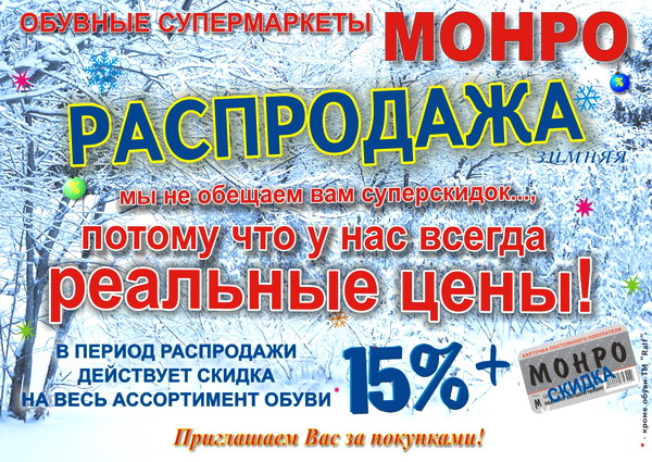 В магазинах "Монро" началась традиционная зимняя распродажа. Всем покупателям предоставляется скидка 15%, плюс скидка по дисконтной карте на весь ассортимент обуви. Мы не обещаем суперскидок.., потому что у нас всегда реальные цены!! Приглашаем всех за покупками.
